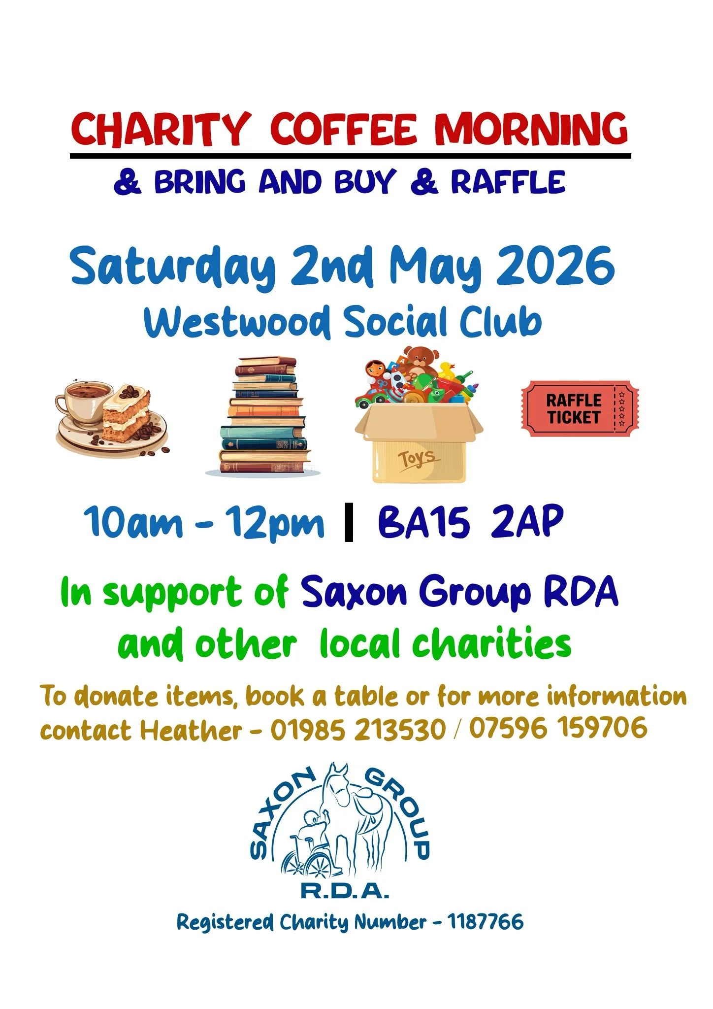 Saxon Group Bring and Buy Fundraiser and Coffee Morning Saturday 2nd May 2026 10.00 a.m. to 12 noon at Westwood Social Club. More details below.